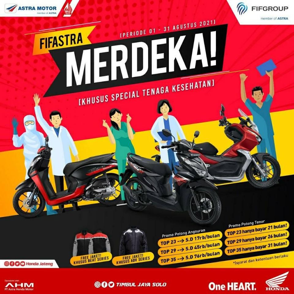 Berjuang bersama, special kemerdekaan dapetin promo potongan tenor hingga angsuran khusus kredit Motor Honda di Timbul Jaya Motor Solo dan dapetin Special Gift dari kami juga.