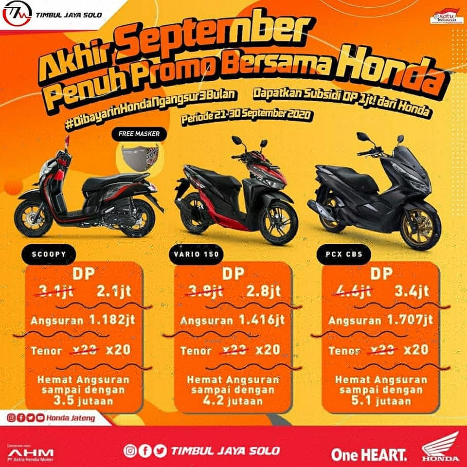 Akhir September Penuh Promo Bersama Honda. Kapan lagi Brosist dapetin cashback hingga 1jt ditambah potongan tenor hingga 3x. Waoww 😱 . Sekarang punya Motor Honda bukan lagi angan-angan. Buruan ke Dealer Timbul Jaya Motors Solo. . . Ayoo ke Timbul Jaya Motors Solo. . . More Info join with us #timbuljayasolo : 💡 Customer Care – 085642777246 💡 Instagram – @timbuljayasolo . 💡 Facebook – Timbul Jaya Solo 💡 Twitter – @timbuljayasolo 💡 Website – www.timbuljayamotor.com 💡 Email – [email protected] 💡 GMap/Waze – Timbul Jaya Motors Solo . 📣 MOTOR ITU HONDA,HONDA ITU TIMBUL JAYA 📣